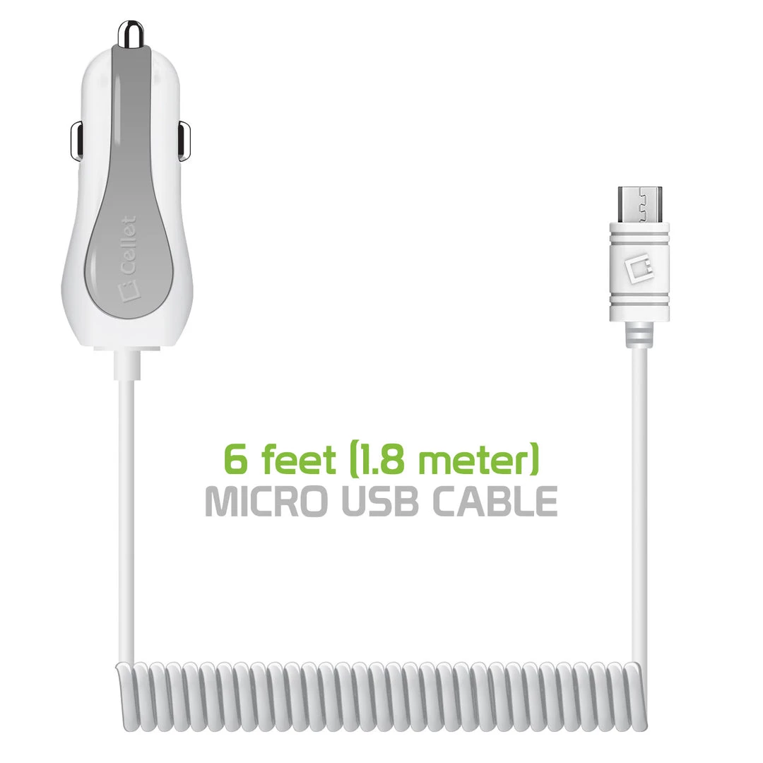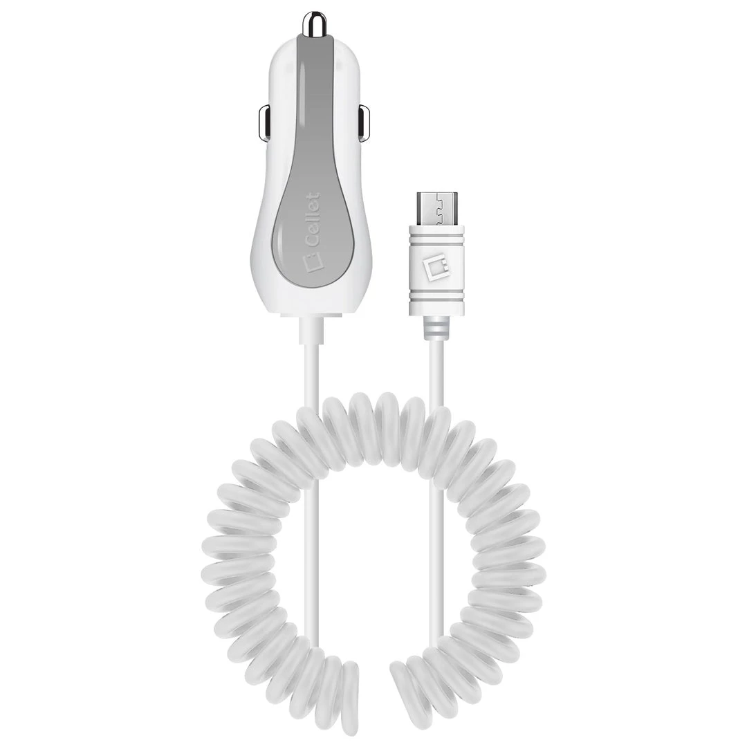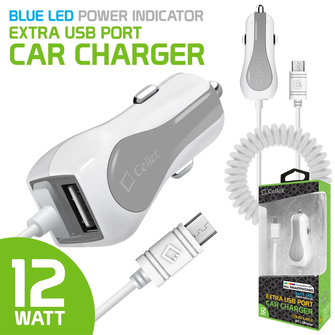 Charge two devices at the same time with the Cellet 2.4 Amp Micro USB Car Charger. Equipped with a micro USB coiled cable and additional USB port, it allows you to charge up to two devices (either two smartphones or 1 tablet and smartphone) simultaneously at rapid speeds. The blue LED light indicator shows that your device is plugged in and charging; built-in smart IC chip technology prevents your device from overcurrent, overcharging, and overheating.
