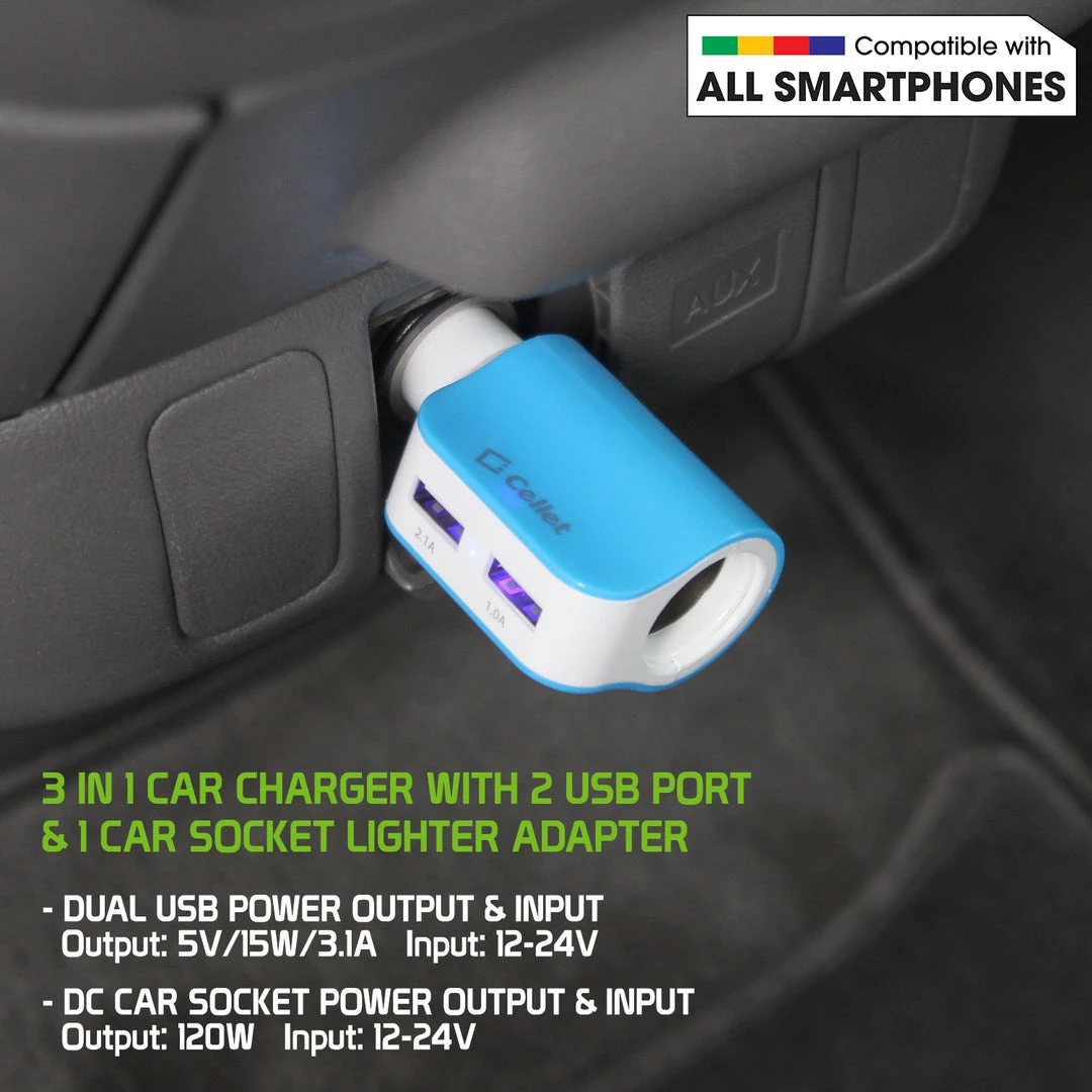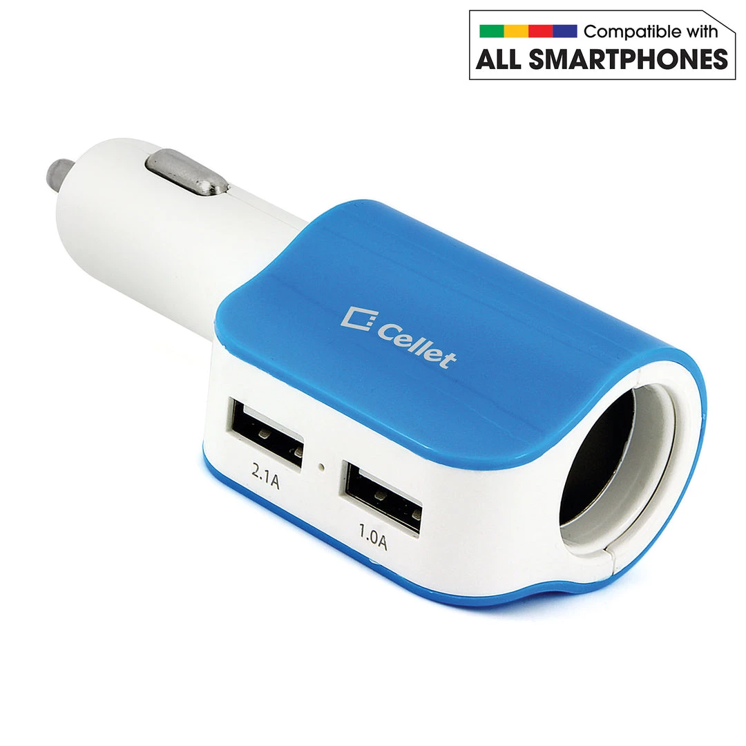 Equipped with two (2) USB ports, you may charge up to 3 devices simultaneously with the Cellet Dual Port & Cigarette port car charger. Convert the cigarette lighter port into a multi-functional charging adapter and maintain up to 3 electronic devices powered. Increase your charging outlet by easily attaching an additional car charger into the cigarette lighter charging port. Charge your devices with high efficiency and low heat. The blue light indicator lets you know your devices are ready to be charged rapidly. You may charge devices such as iPhone 7, 7 Plus, Samsung S8 Edge, Samsung s8 Edge Plus, LG G6, Note 8, iPad, digital cameras, GPS, etc. at the same time. Built-in technology protects your device against short-circuiting, over-heating, over-currents, and over-charging. The convenient compact size allows you to store it easily in your glove compartment or your computer bag.