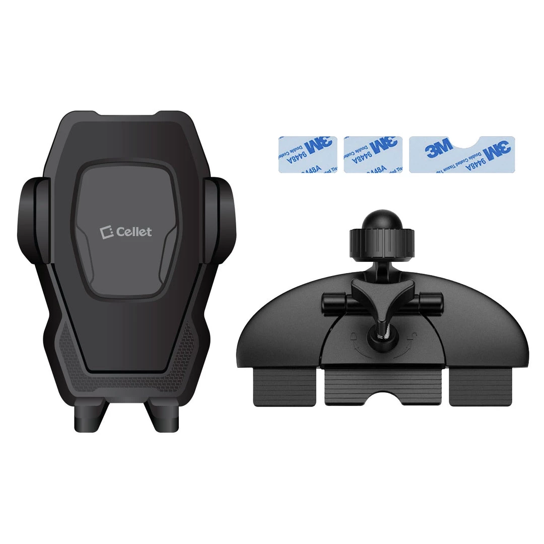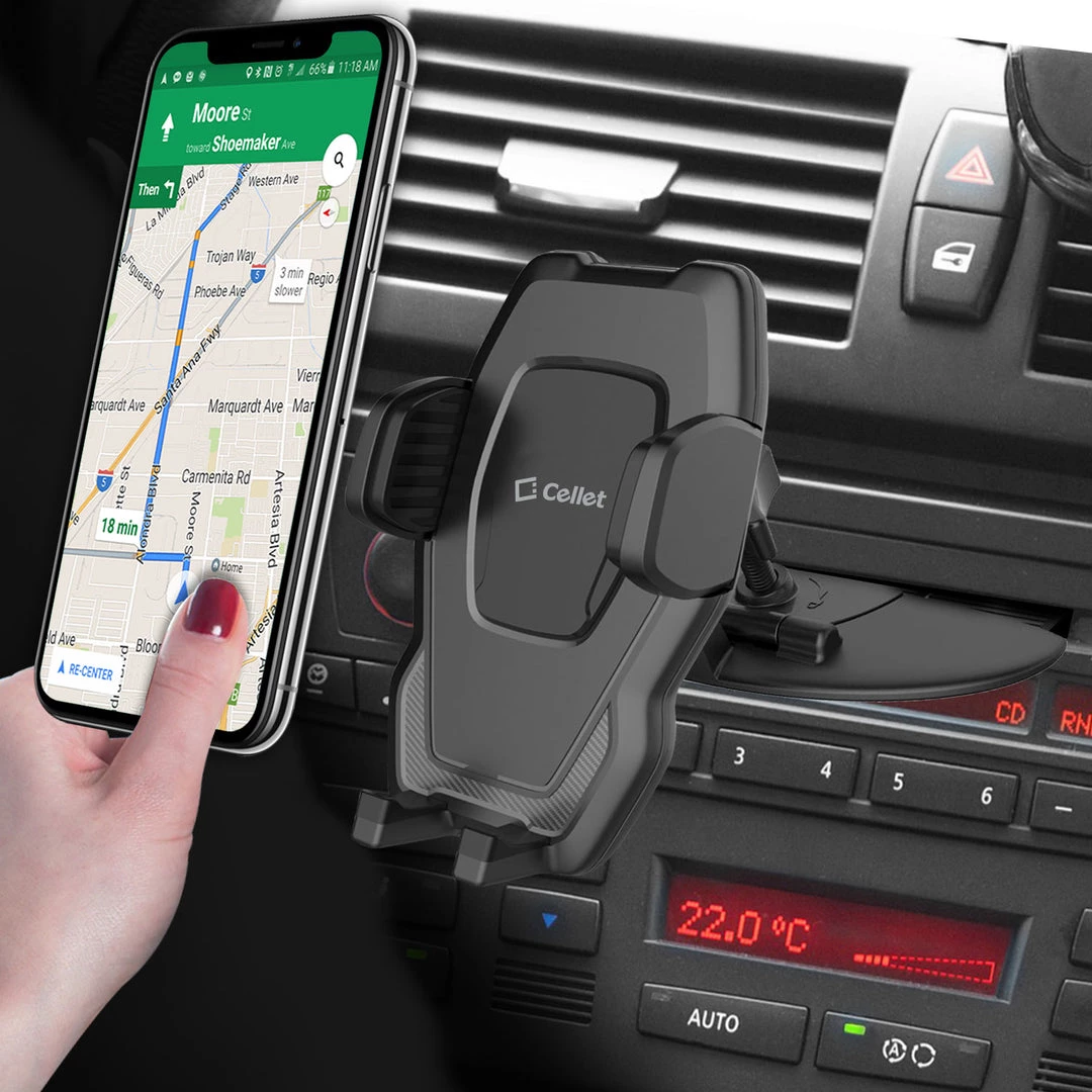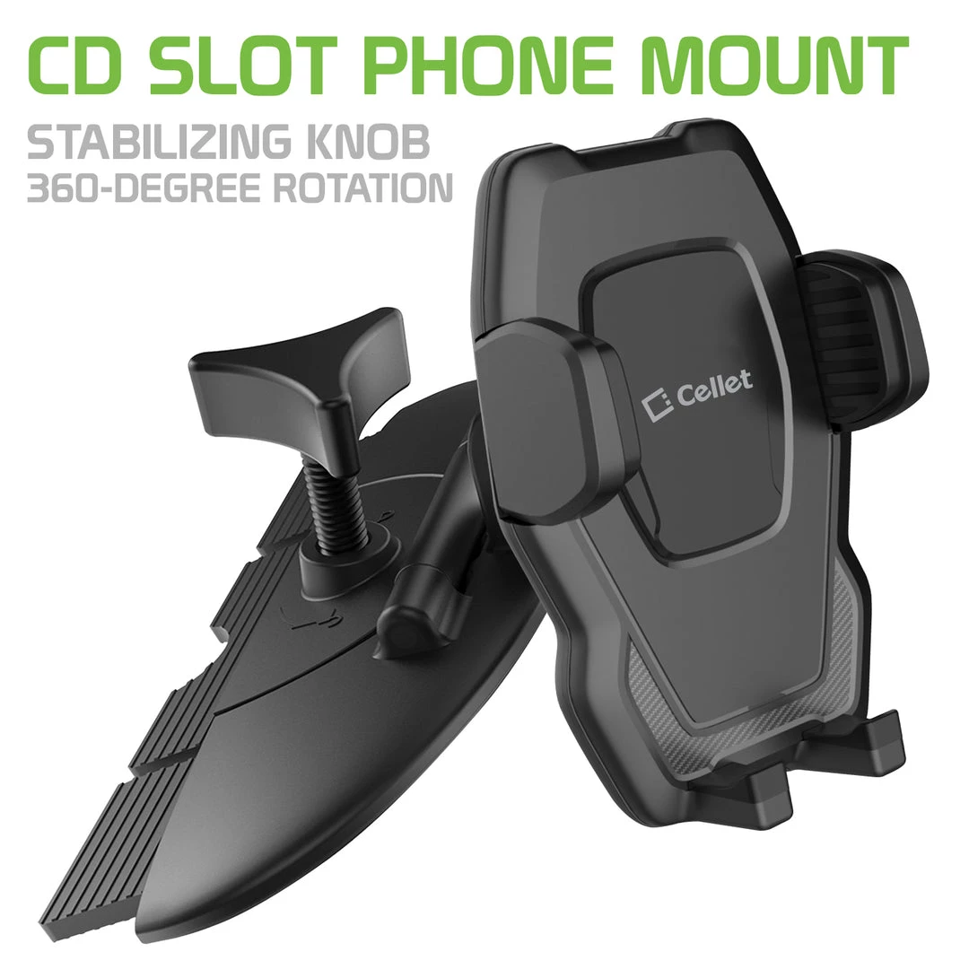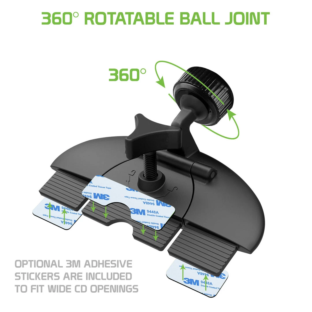 Mount your smartphone without the hassle of sticking your holder onto your windshield or dashboard with the Magnetic CD Slot Phone Mount. The cradle has non-slip rubberized extendable arms and backing to secure and prevent any scratches on your device. Included in the package are 3M adhesive stickers that can be placed onto the holder (if your CD opening is too wide), two rectangle magnets: one with an adhesive backing and one without and 2 protective films. 360 Degree rotation capability allows your device can be positioned at any desired angle. A turn knob tightens the CD base inside your CD slot, reassuring that it will not fall out as you drive.