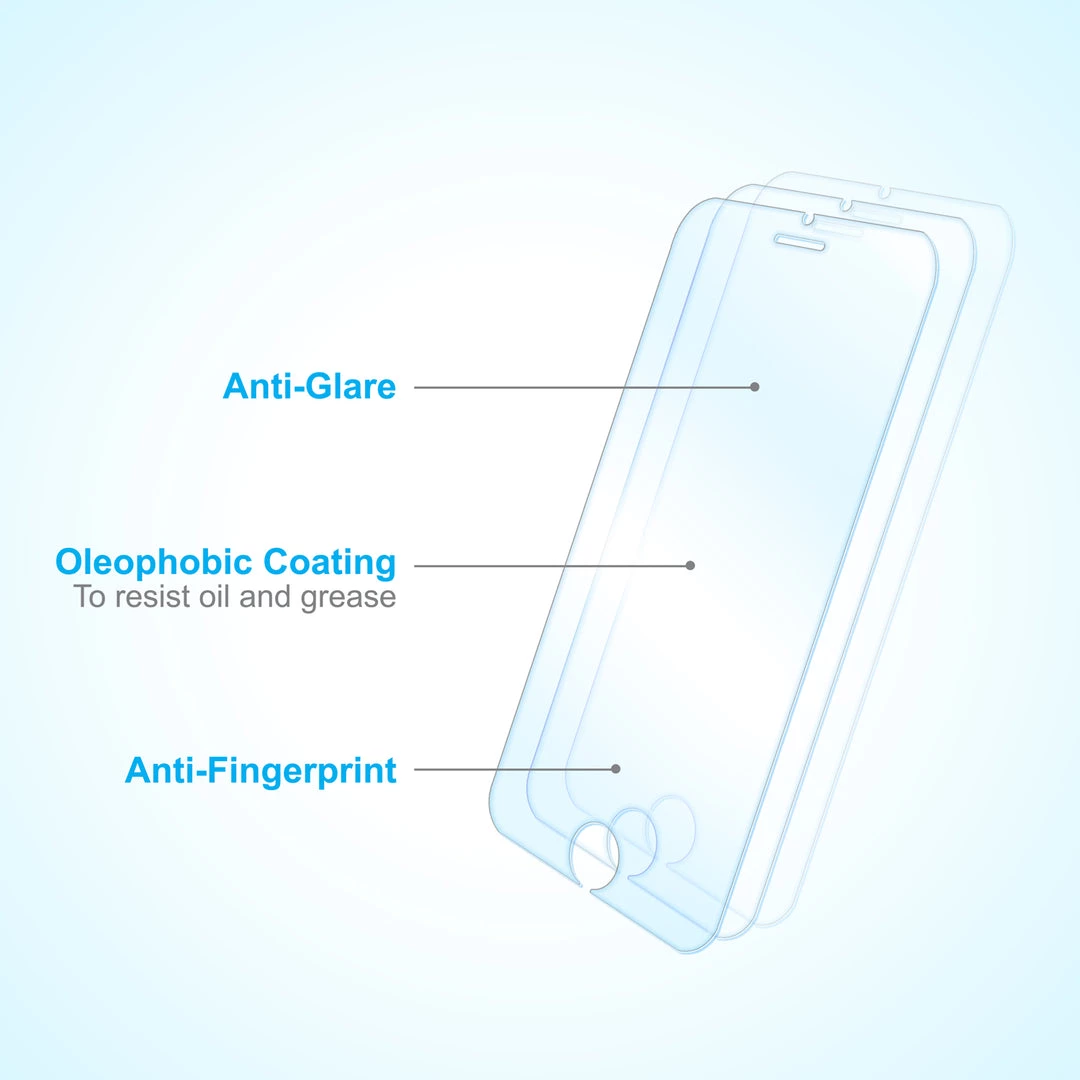 Made of tempered glass, this anti-glare screen protector provides the ultimate protection for your screen without hindering touchscreen capabilities. Each tempered glass screen protector provides 9H hardness strength with minimal thickness, scratch-proof protection, and its oleophobic coating provides resistance against smudges and fingerprints. Made with anti-glare properties, the matte finish aids in it reducing eye strain by blocking the glare from sunlight. Simple to install, the package includes an alcohol wipe, microfiber cloth, blue film dust remover, and instructions to assist in the application of the screen. (Fits Apple iPhone SE 2020 / 8 / 7 / 6s / 6)