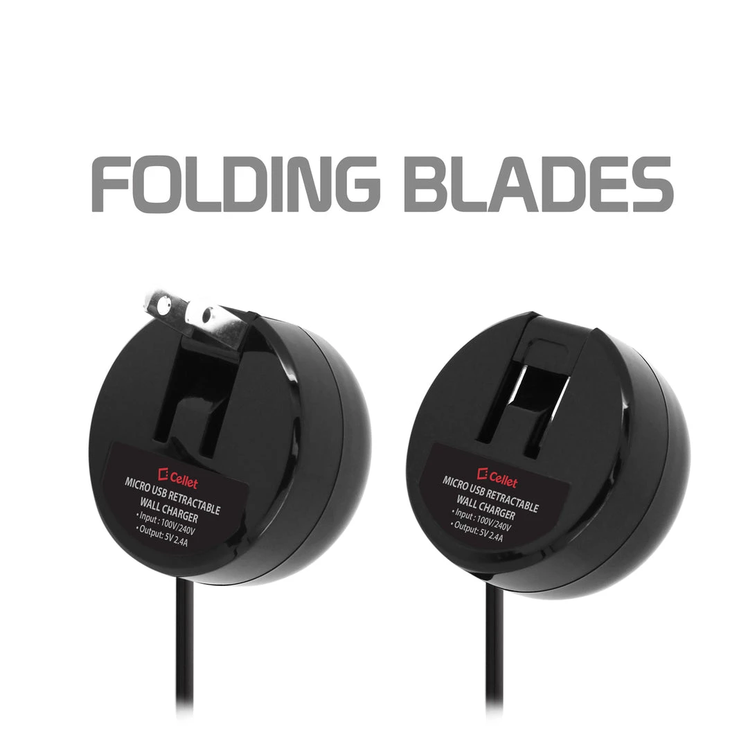 Equipped with 12W/2.4 amps output, this micro USB retractable home charger can charge your micro USB device at rapid speeds. Our chargers are built with advanced power smart detection that identifies the device’s max charging speed and smart IC chip technology that provides overcharge, overheat, and overcurrent protection. Featuring a compact design with folding blades and an innovative retractable mechanism, the 2.5 ft. cord rapidly retracts for easy storage without any tangles.